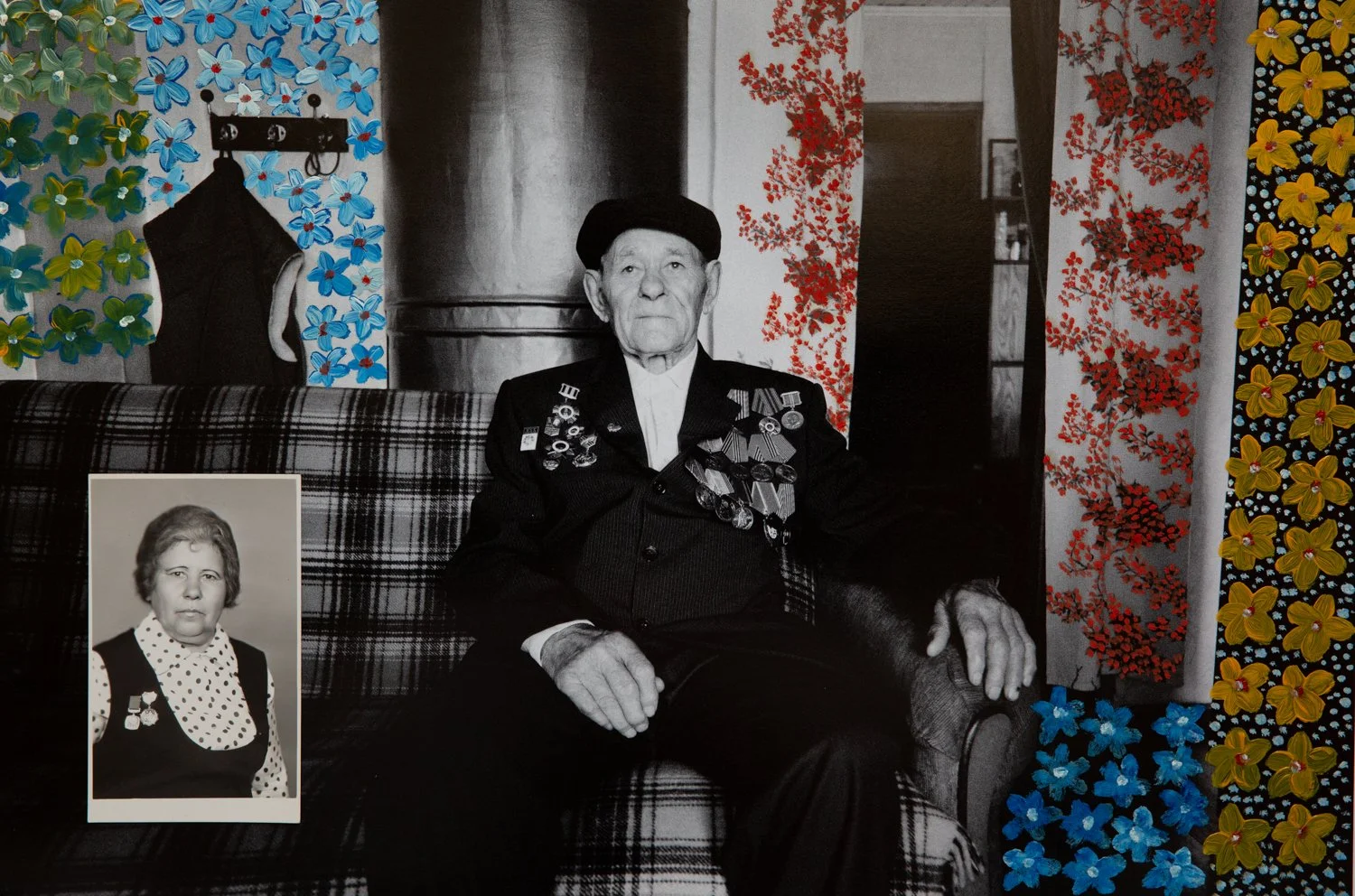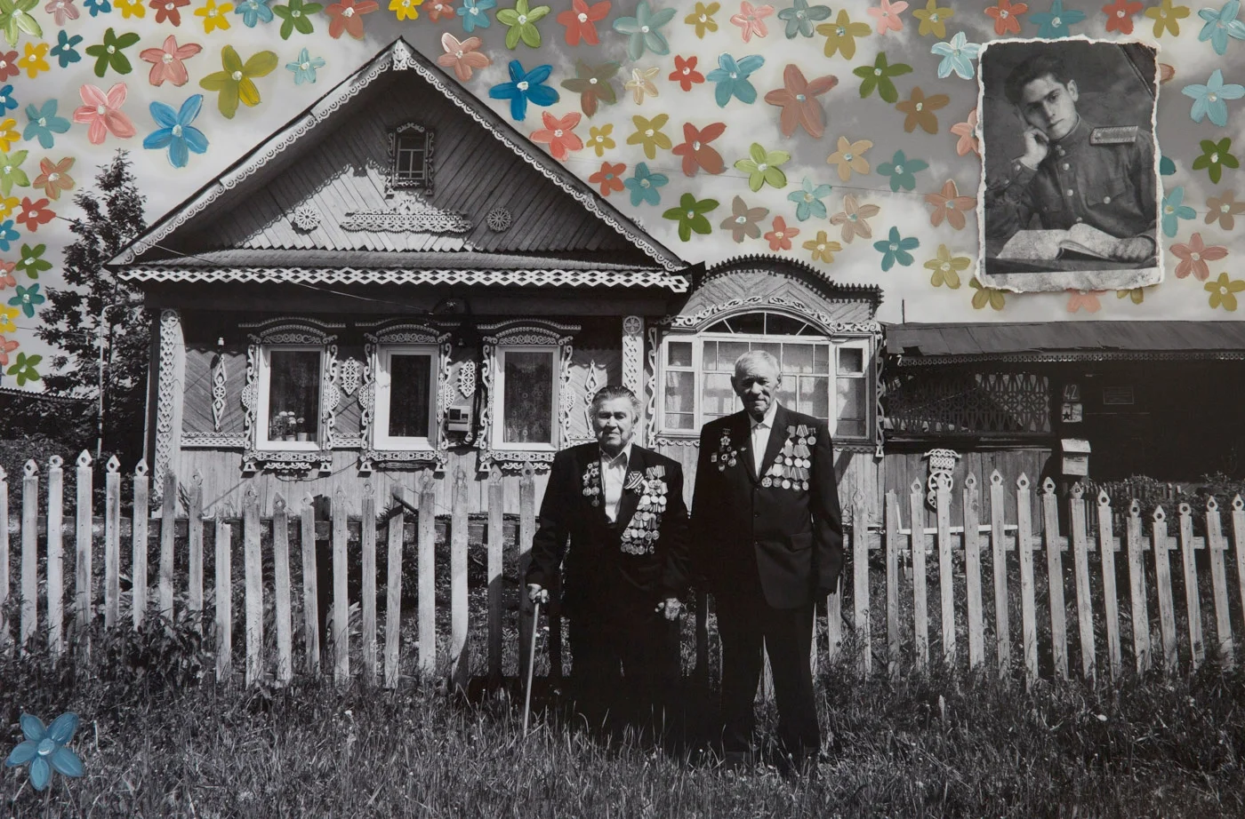 An elderly couple wearing World War II medals posing in front of a Lenin sculpture in Ufa, Bashkortostan. The artist has superimposed a photograph of her grandmother who was a nurse during the same war. This work explores the ways in which photograp